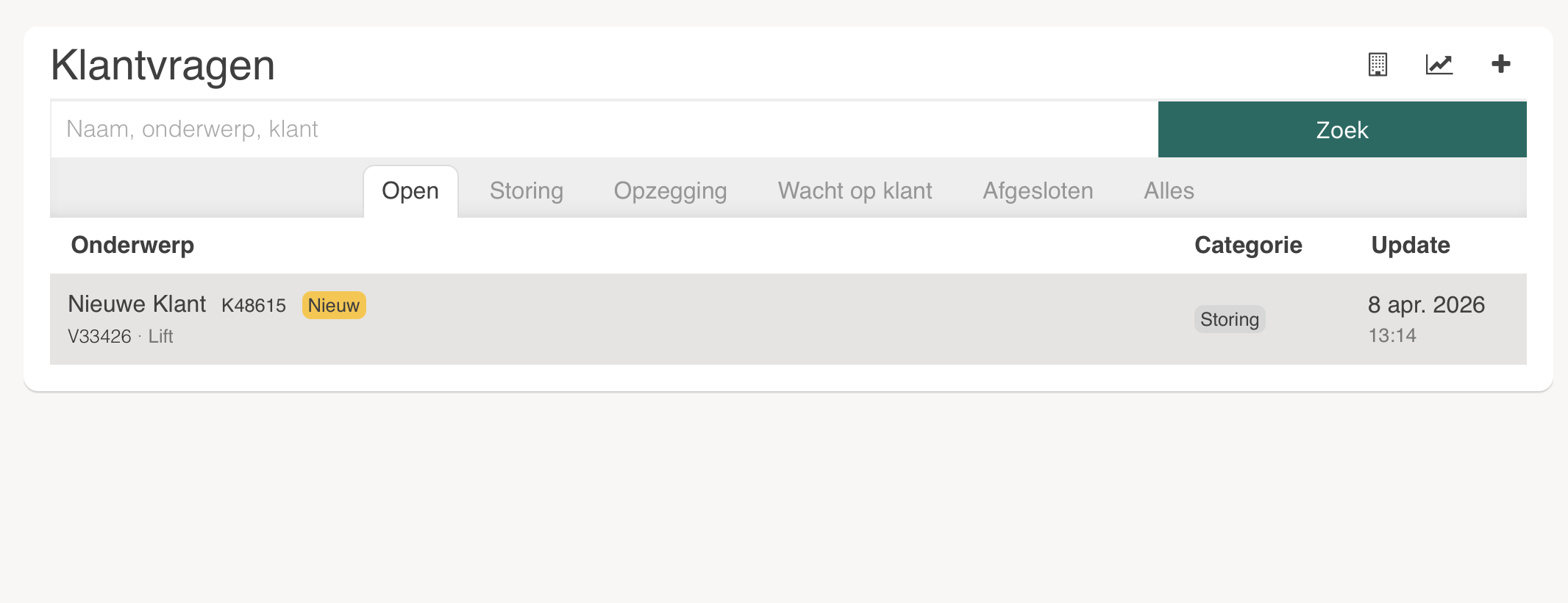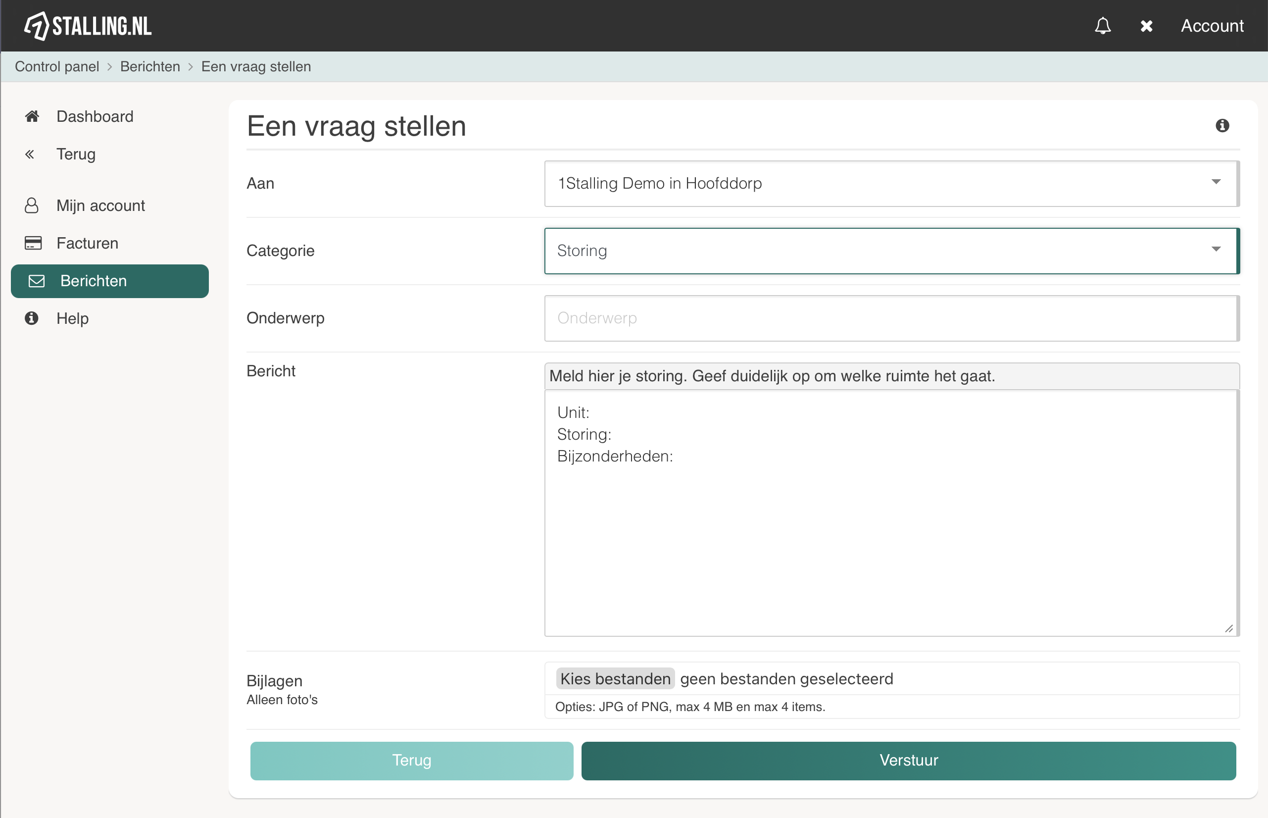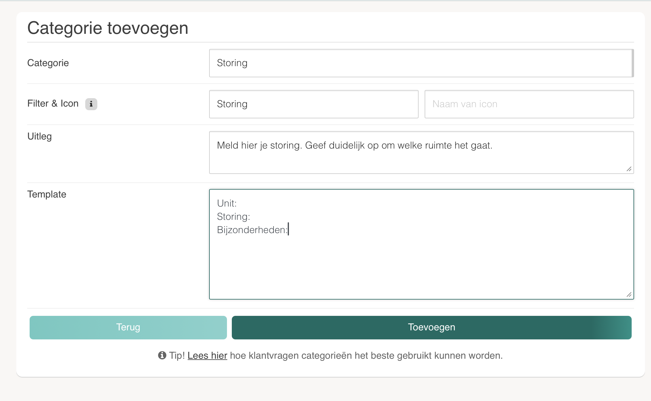 Na het toevoegen van een categorie kunnen zowel klanten als de verhuurder deze kiezen bij het aanmaken van een klantvraag. De naam en uitleg wordt weergegeven, het template wordt automatisch ingevuld en helpt op weg bij het aanmaken van het totale bericht.
