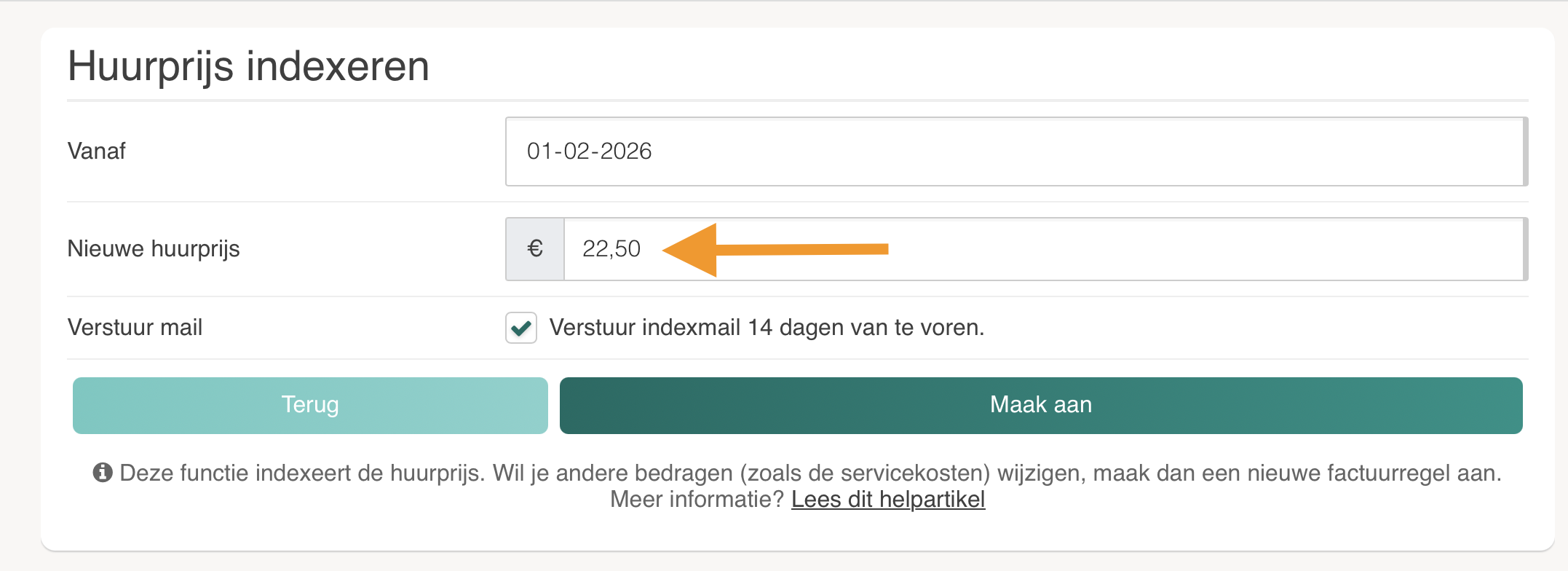 Vul hier de gewenste nieuwe huurprijs in en de datum van ingang en klik ook 'Maak aan'. Je kunt hier ook kiezen of je een e-mail wilt versturen van de aankomende verhoging.