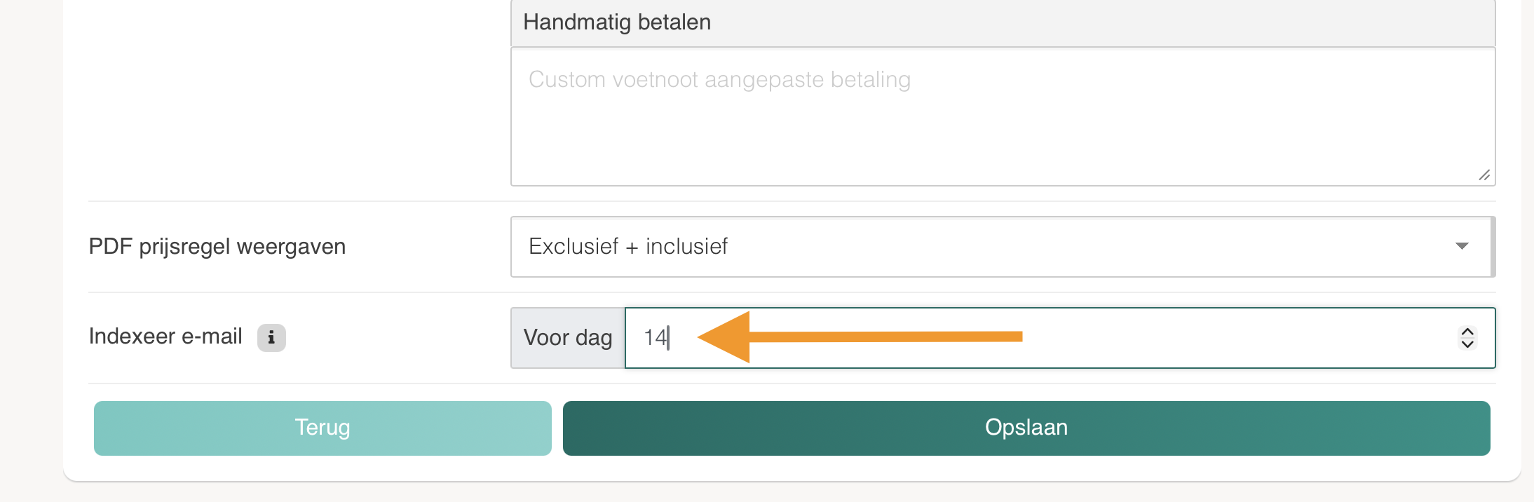 Indien je deze optie niet ziet moet je deze nog instellen via Beheer -> Facturatie, daar kan je instellen hoeveel dagen van tevoren de mail verstuurd moeten worden.