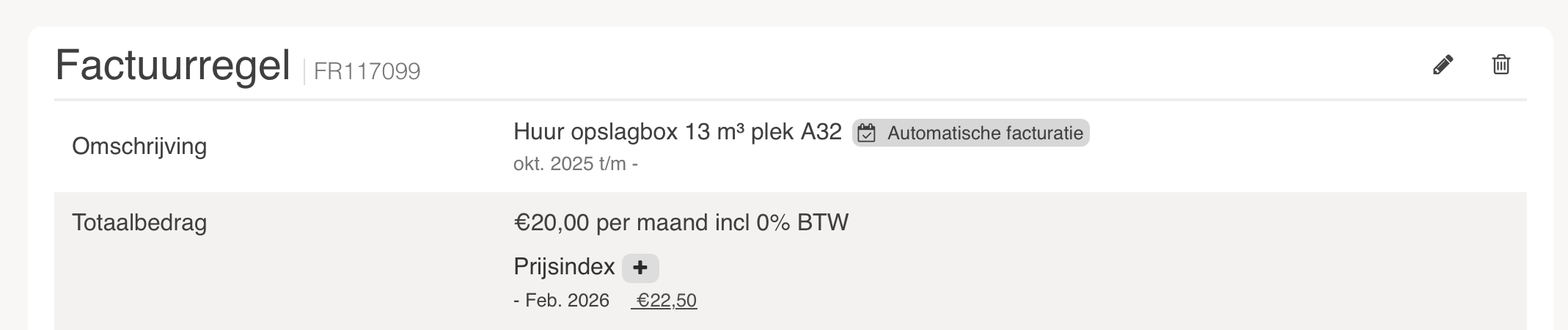 Vervolgens zie je op diverse plekken dat de indexering juist is opgeslagen. De factuur van februari zal in dit geval €22,50 bedragen. Je kan uiteraard alleen in de toekomst indexeren en het bedrag moet hoger zijn. De overige kosten zoals servicekosten worden met deze functionaliteit niet verhoogd. Is dat de wens? Dan zou je de factuurregel moeten sluiten en een nieuwe toevoegen.