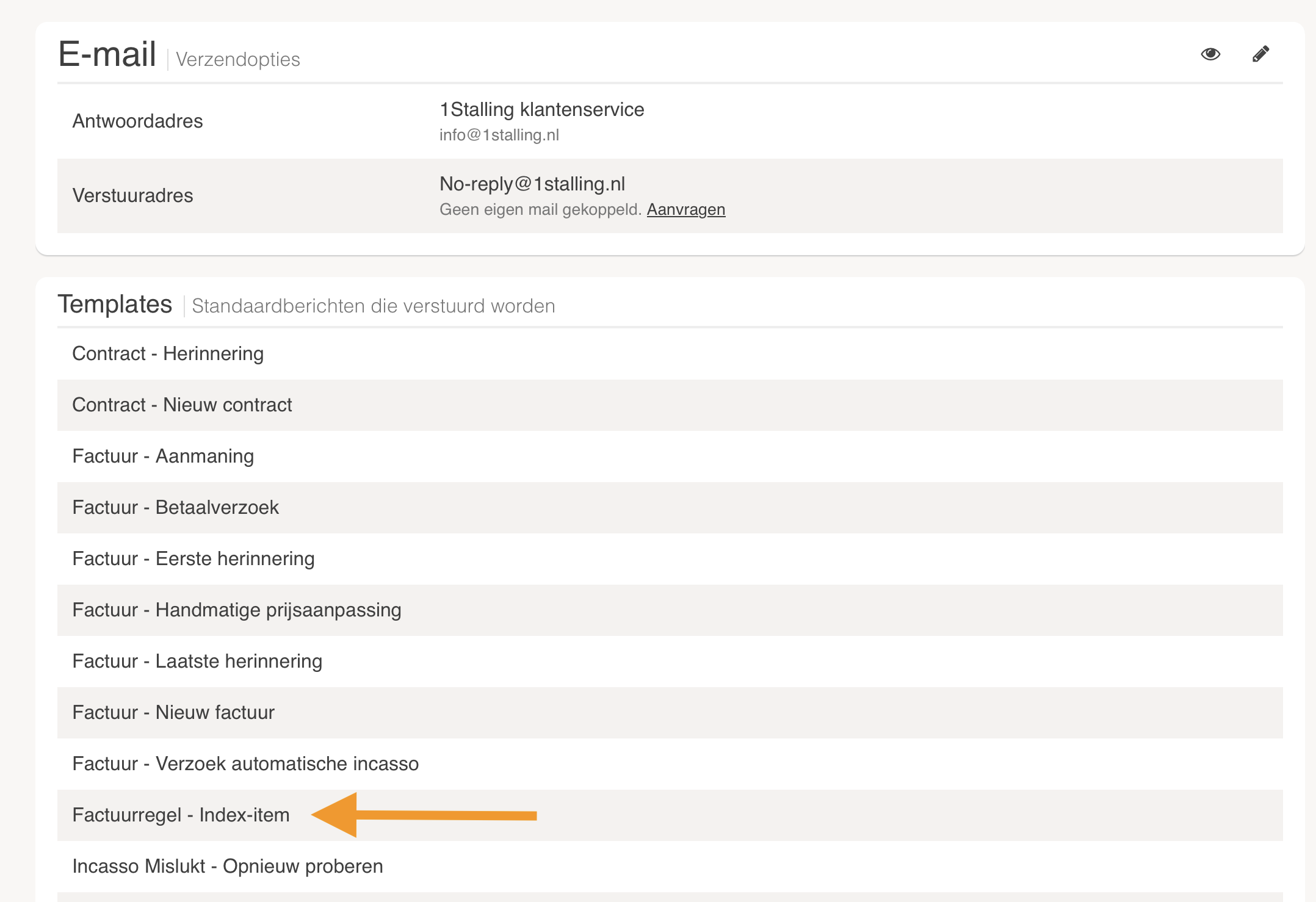 De mail die verstuurd wordt vind je in Beheer -> Emails en het template heet: 'Factuurregel - Index-item'