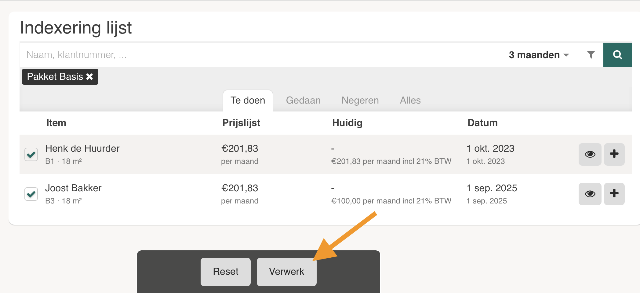 Het is mogelijk om per factuurregel de aanpassing door te voeren, echter is het ook mogelijk om via het statistiekenscherm: 'Indexeringslijst' meerdere items tegelijk door te voeren . Je komt hier o.a. via Beheer -> Statistieken -> Indexlijst.