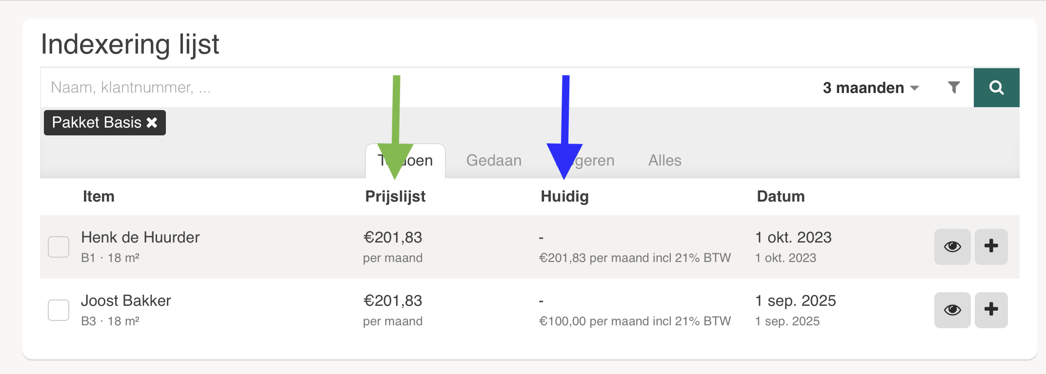 De groene pijl is de huidige prijs volgens het beheer, de blauw pijl is de huidige prijs. Rechts zie je ook nog de datum van de laatste verhoging en de startdatum van de reservering.