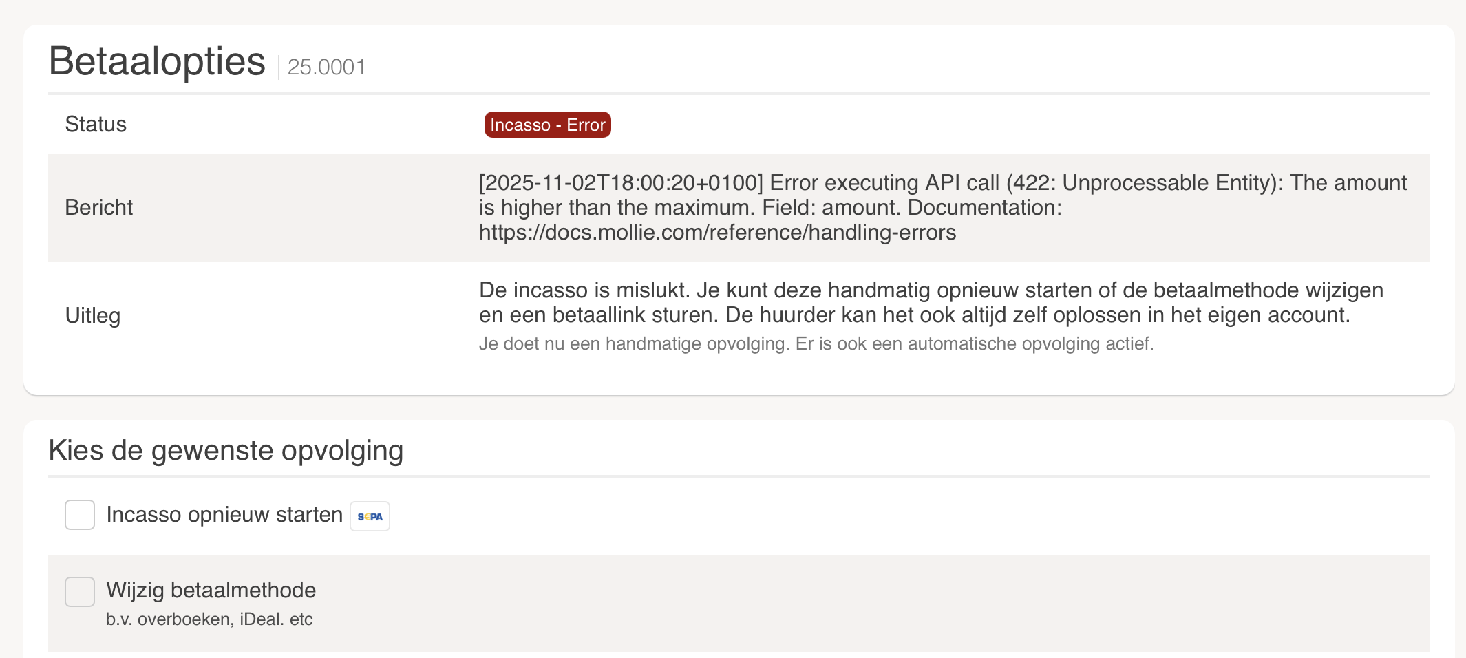 Je krijgt de volgende melding van Mollie, dit betekend dat je een hoger geldbedrag probeert af te schrijven dan mogelijk.