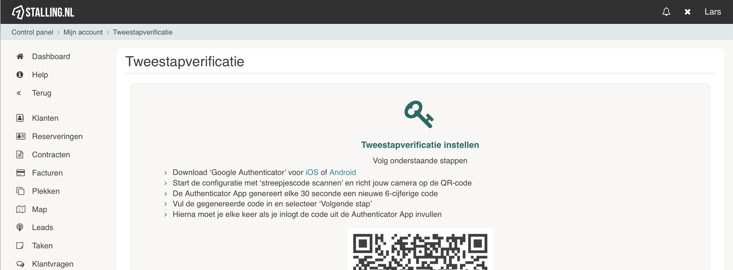 Vervolgens kom je op het volgende scherm, met uitleg en een QR code die gescand kan worden. Om deze QR-code te scannen dien je een geschikte App te hebben, bijvoorbeeld Google Authenticator. Je kan deze downloaden via een van de onderstaande link.