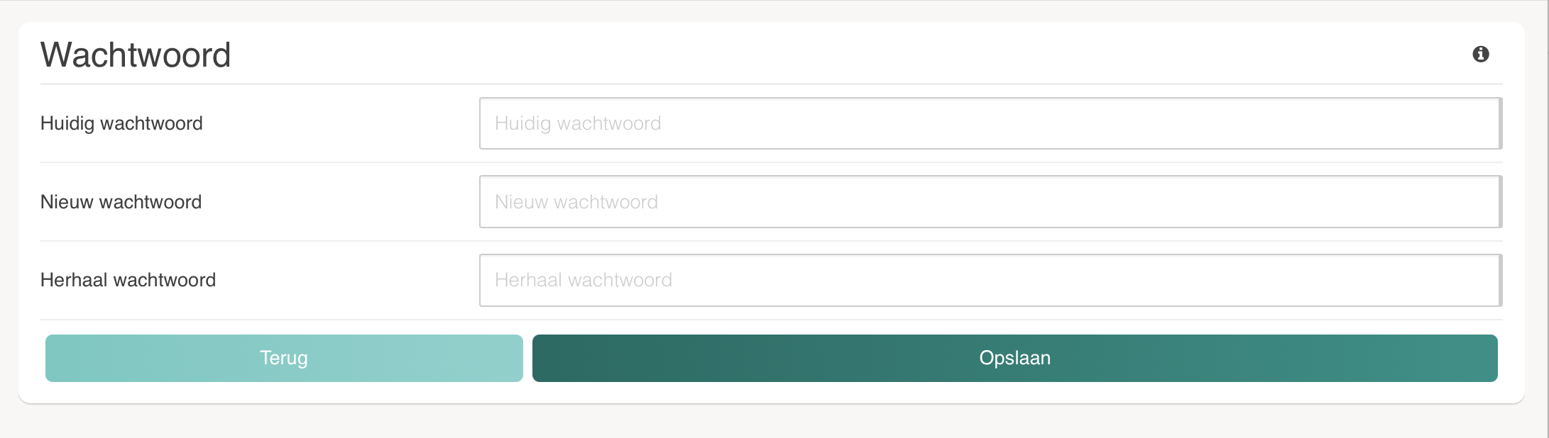 Klik rechtsboven op je naam en daarna op 'wachtwoord'. Je kunt hier je wachtwoord instellen. Gebruik bij voorkeur een wachtwoord dat niet eenvoudig te raden is en voldoet aan de volgende eisen: