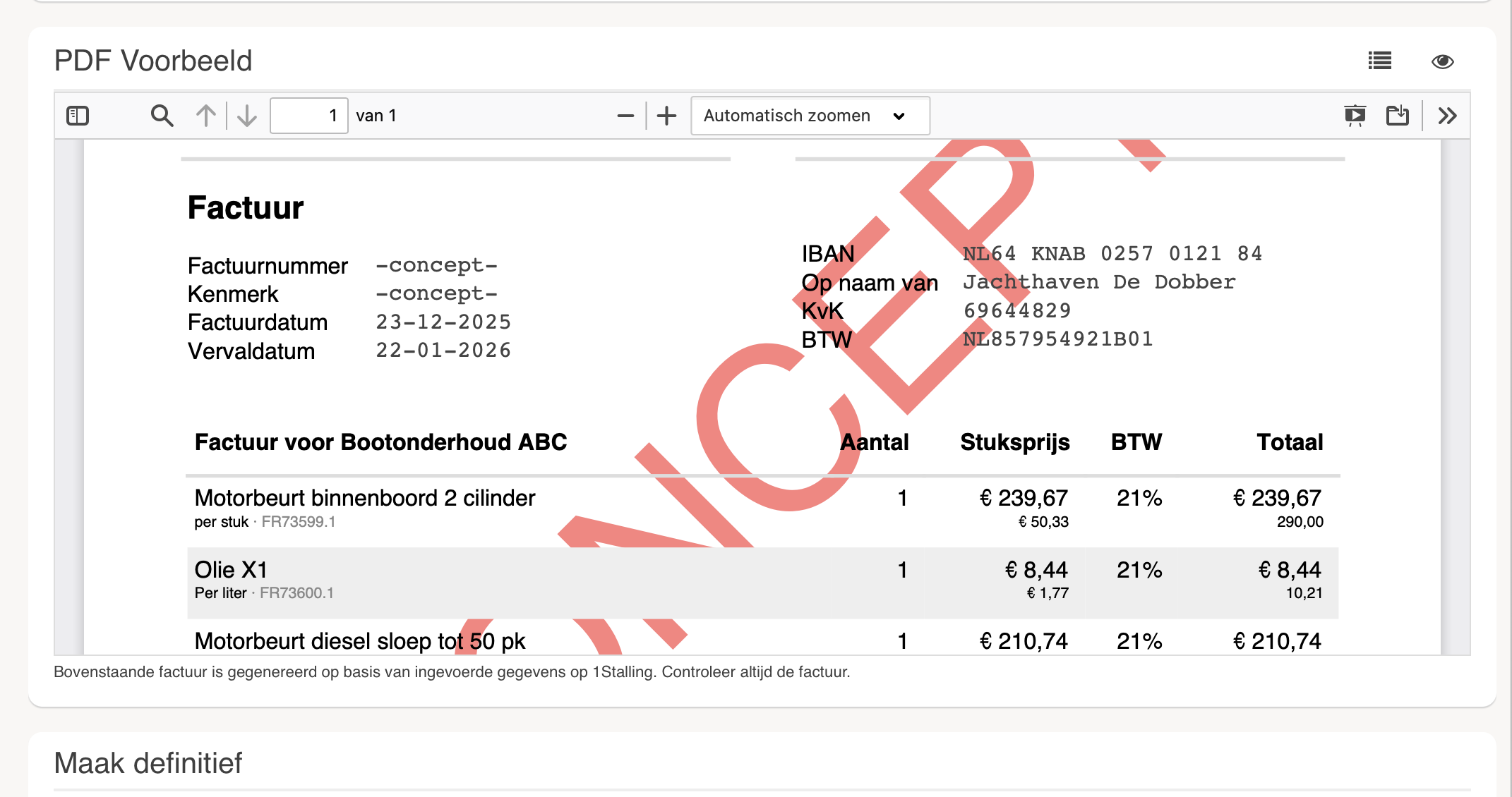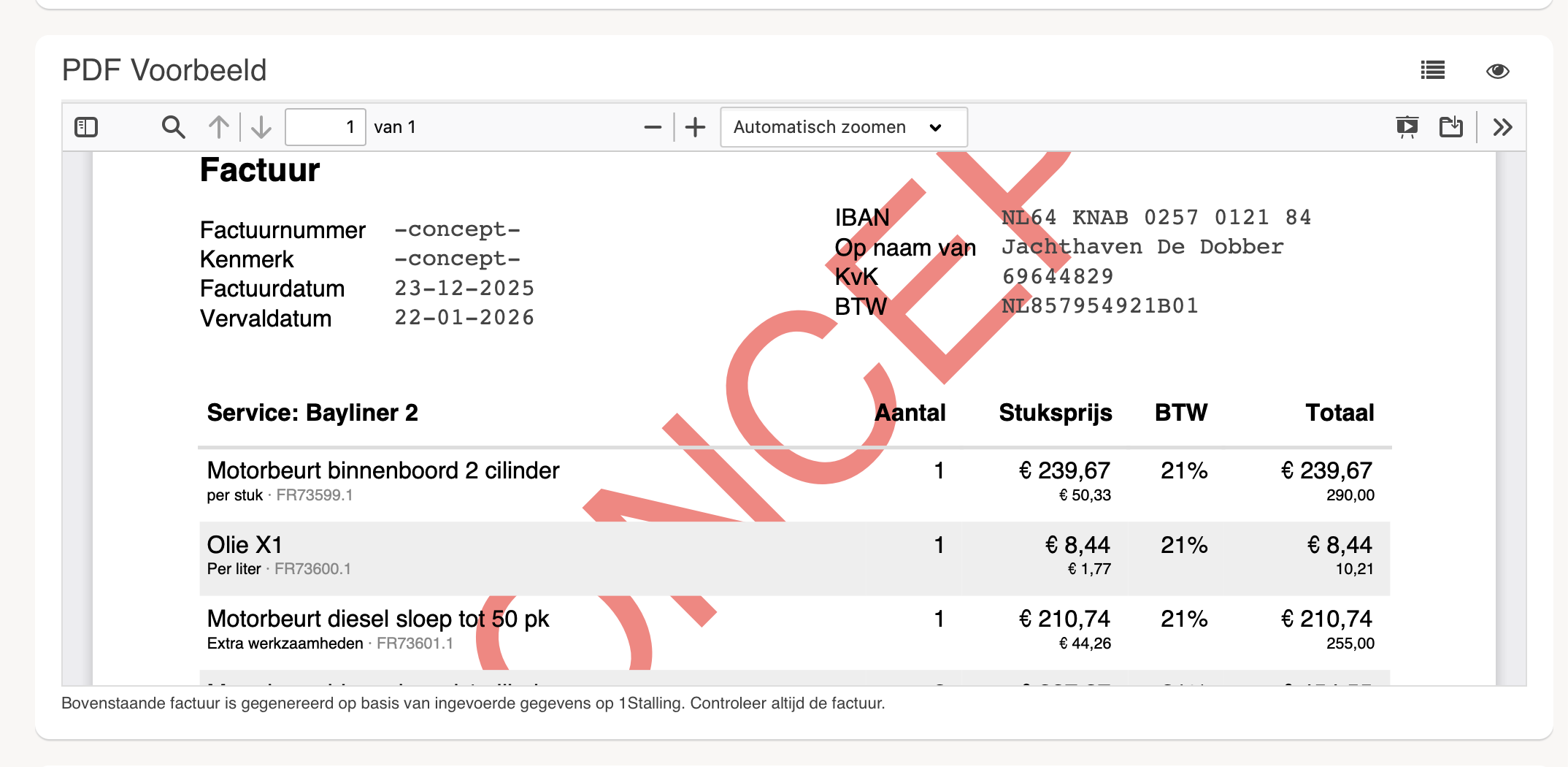 Je kunt hier invullen, bijvoorbeeld: 'Factuur voor Bootonderhoud ABC' en het komt als het volgt op de factuur.