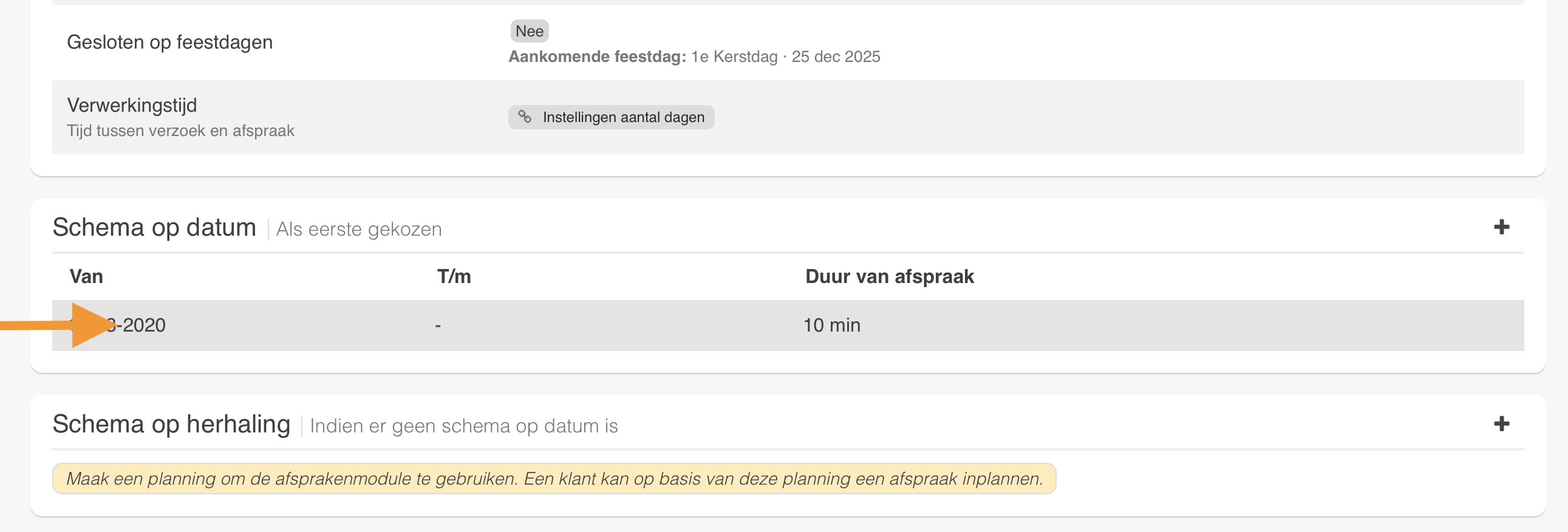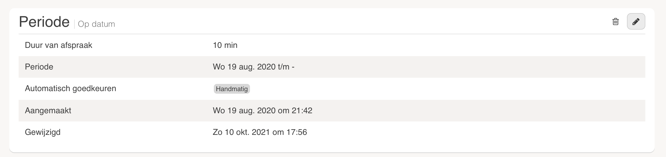 Wanneer je (bijvoorbeeld in de winter) de locatie vol zet is het vaak handig om te weten wanneer het object weer opgehaald wordt. Je kunt dit instellen in het Beheer -> Afspraken, gebruikt vervolgens het potloodje rechtsboven. Klik vervolgens de periode aan die actief is of waar je het wilt instellen.