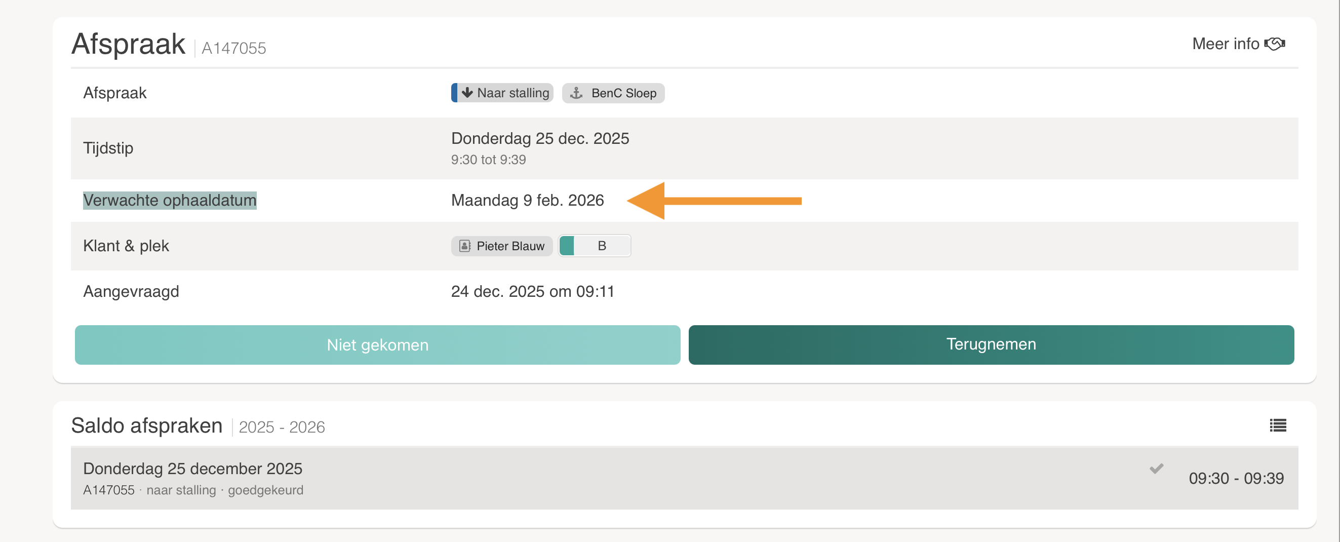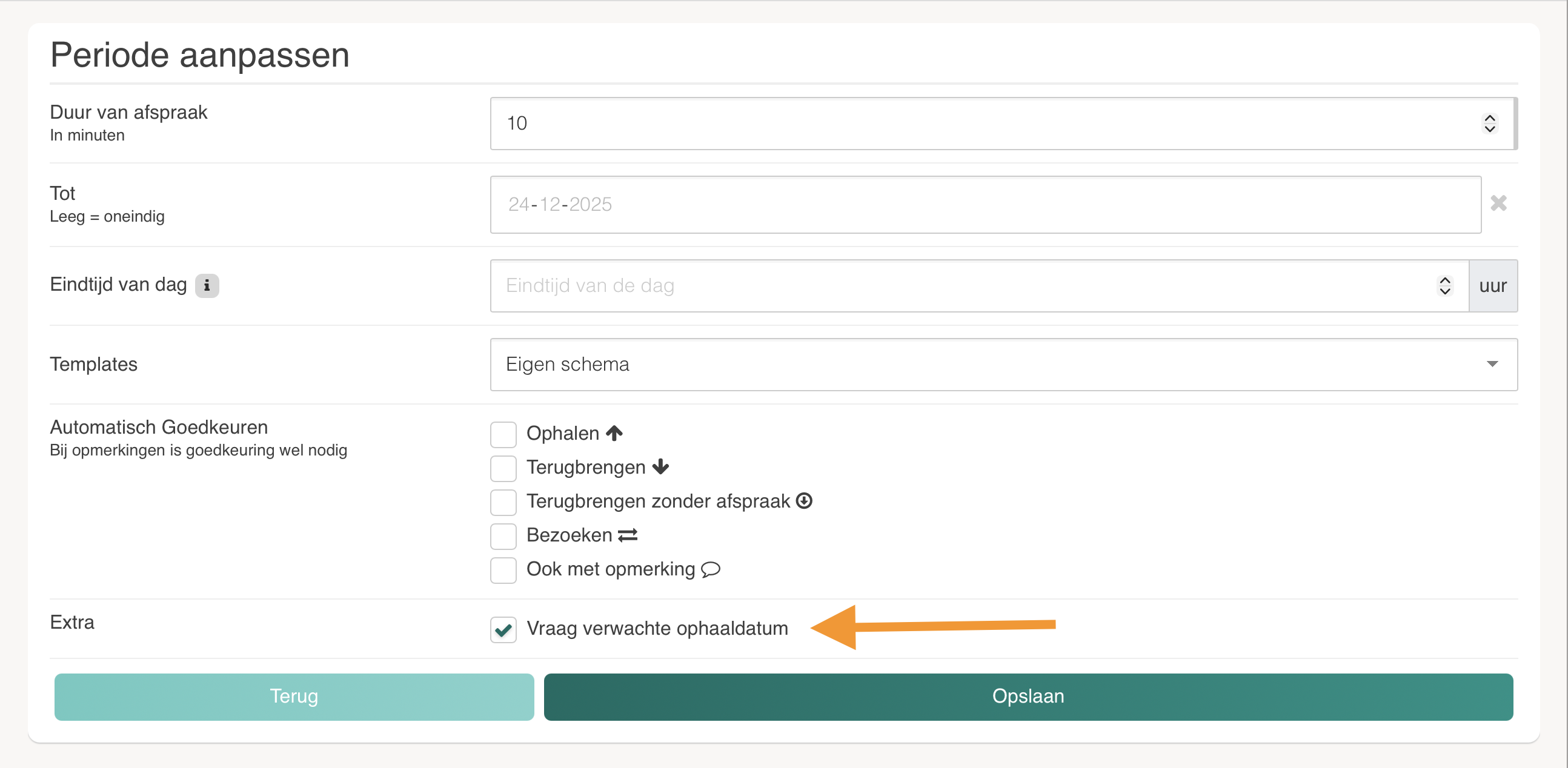 Na het aanzetten zie de klant de volgende optie 'Verwachte ophaaldatum' bij het maken van zijn ophaalafspraak.