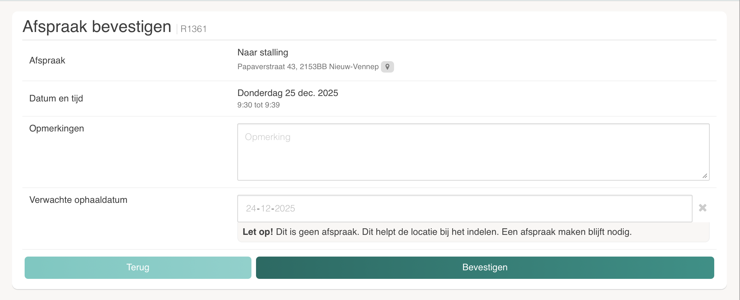 Wanneer hij/zij dit invult zie jij dit vervolg terug bij de wegbreng afspraken, zodat je bij het terugzetten rekening kan houden met de indeling. Voor de klant is het uiteraard nog wel verplicht om een nieuwe afspraak te halen met de definitieve ophaaldatum.