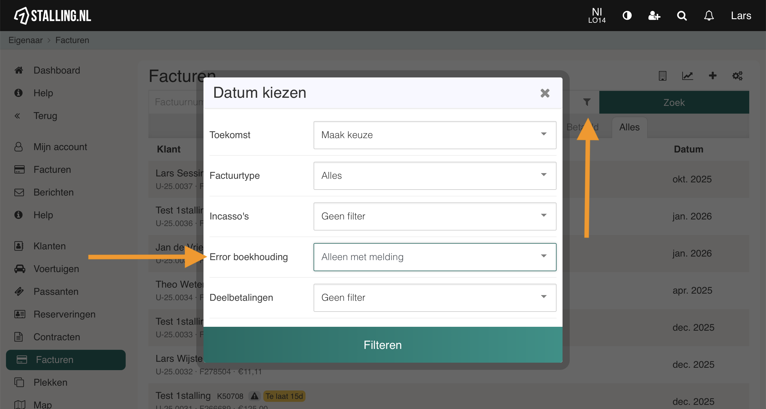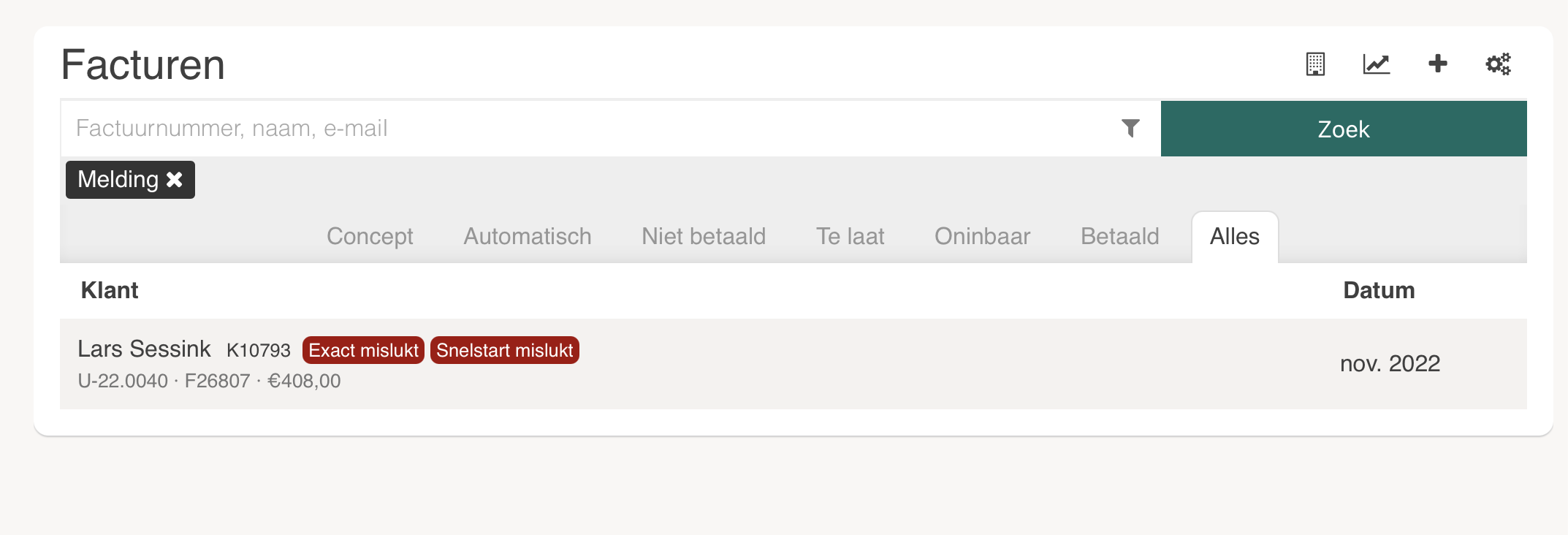 Gebruik hiervoor de volgende filter optie (naast de zoekknop) en selecter 'Error boekhouding' en vervolgens 'Alleen met melden'. Je ziet dan vervolgens de facturen met een probleem.