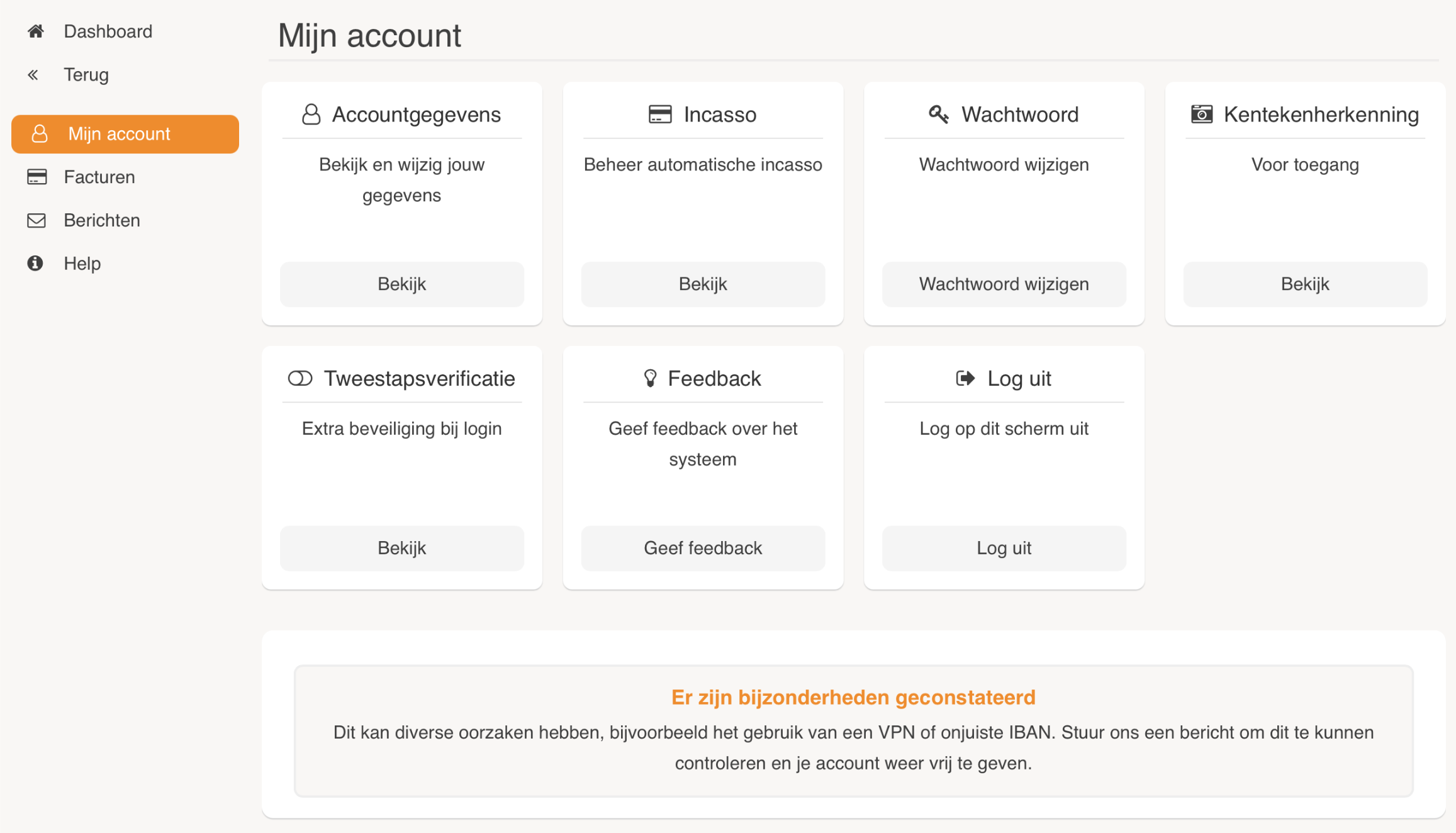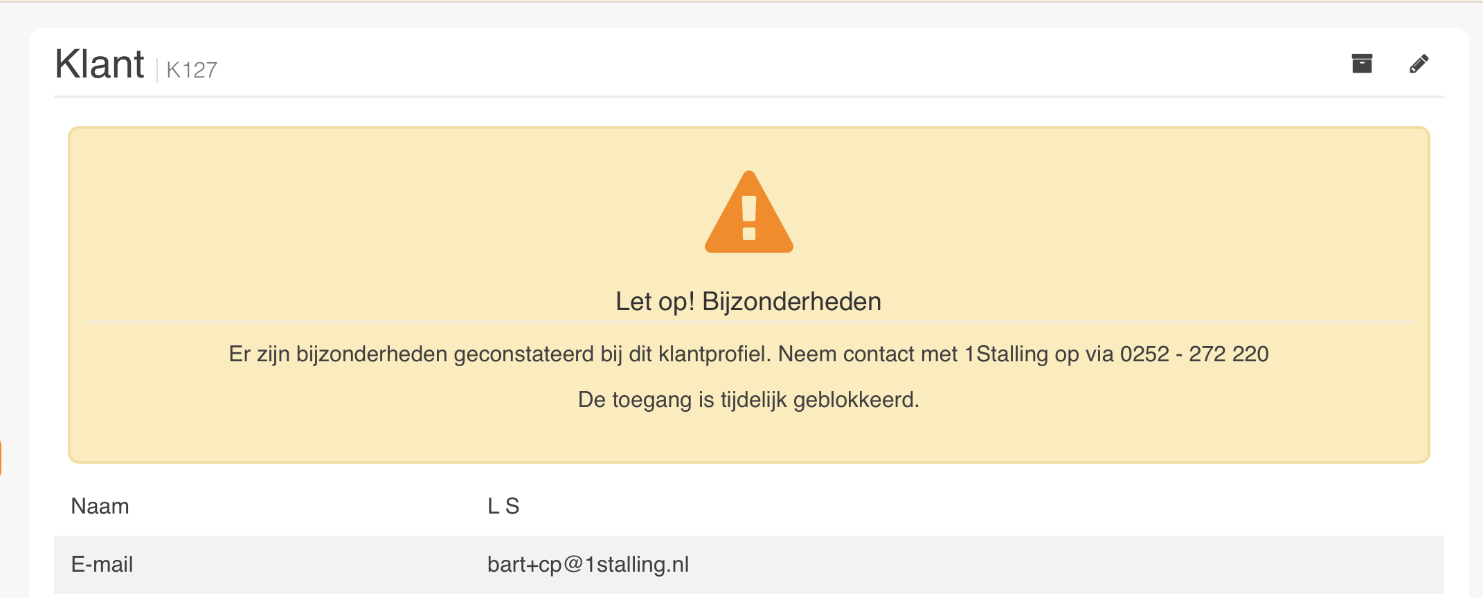 Er verschijnt een grote melding in de klantkaart, ook als de klant opnieuw wordt toegevoegd. We checken bijvoorbeeld op telefoonnummer en IBAN. Zo waarschuw je ook je collega's.