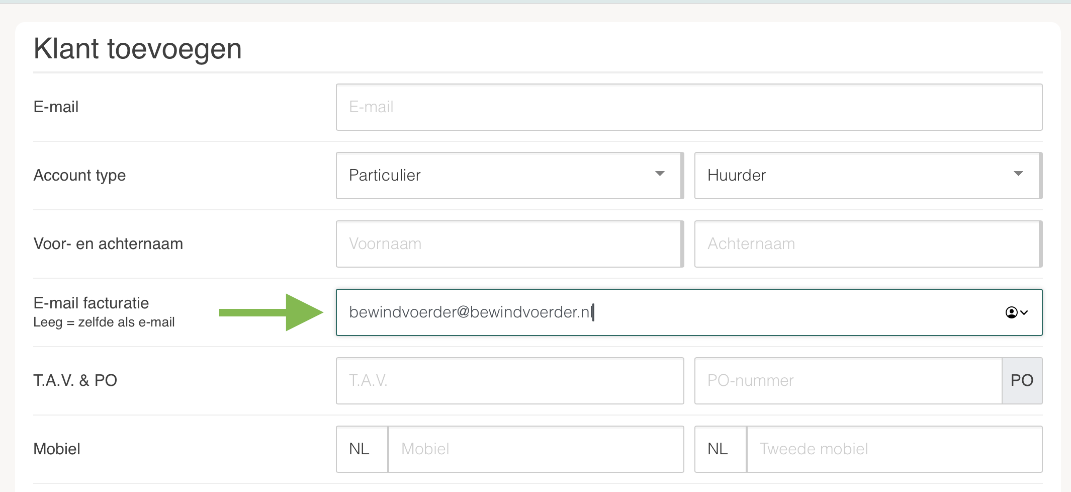 Selecteer in dat geval het account type 'bewindvoerder'. Hierna moet je per cliënt een ander e-mailadres gebruiken, aangezien het e-mailadres uniek is per account kan je niet een account maken met 2 verschillende factuur- en contractgegevens.